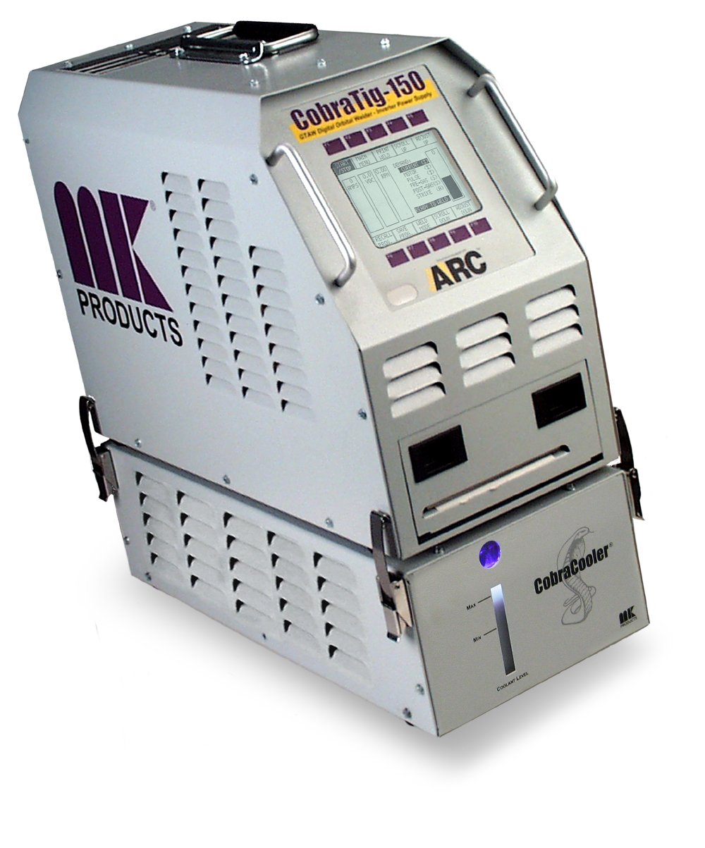 CobraCooler shown attached to the CobraTig®Mechanically integrated assembly latches tightly under CobraTig 150 SM power supply |